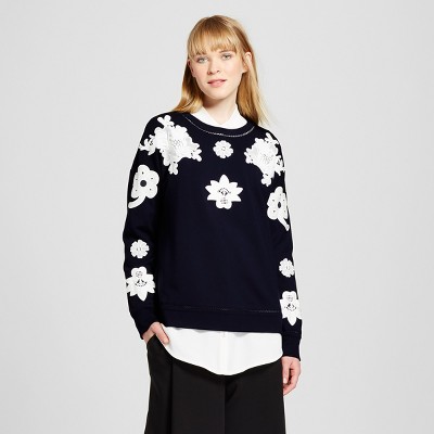 $30 Women's Navy and White Floral Lace Appliqué Sweat Top