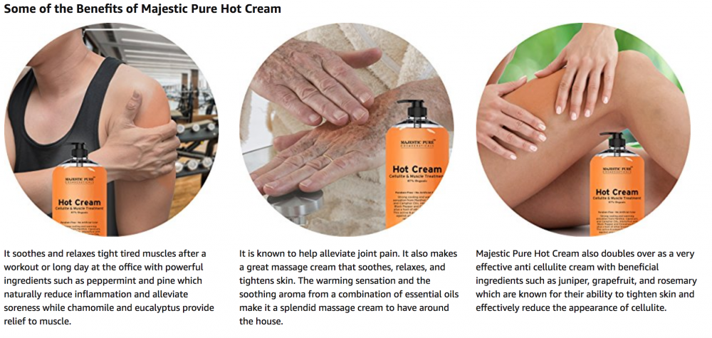 Majestic Pure Hot Cream; 100% natural; contains 87% organic content; no harmful chemicals; cruelty free; reduces the appearance of cellulite; muscle pain relief cream; made in USA