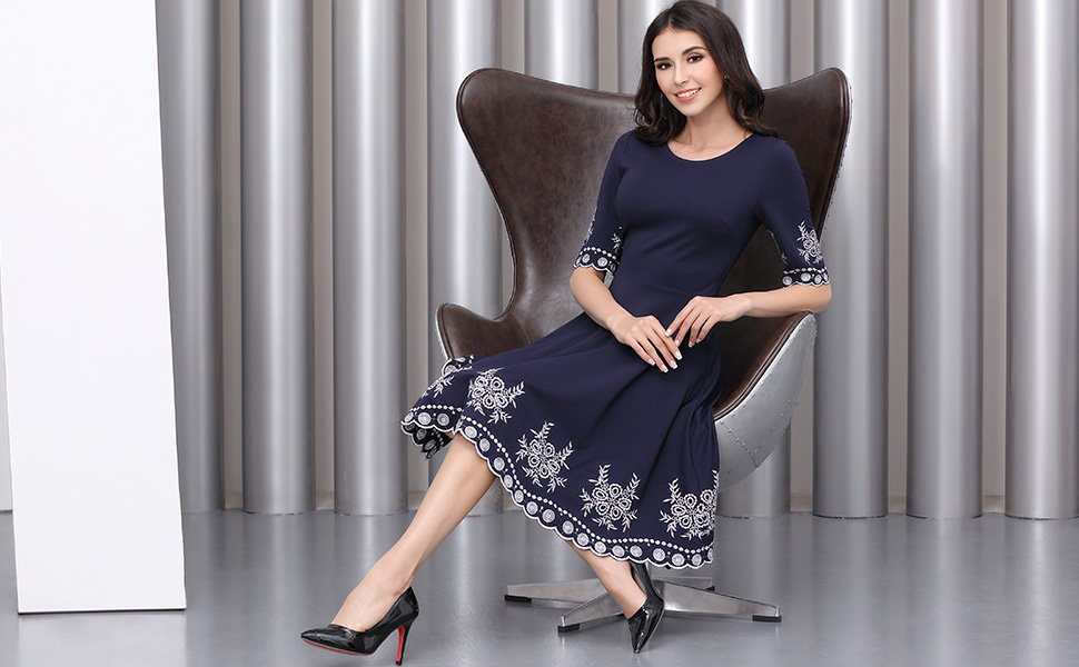 Miusol Women's Retro Deep-V Neck Half Sleeve Vintage Casual Swing Dress