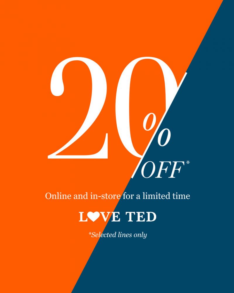 Ted’s spreading the love with up to 20% off selected lines. But remember not to dilly dally, these styles won’t be around for long. Discount applied at checkout.