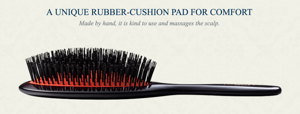 The unique rubber-cushion pad, made by hand using Mason Pearson’s original techniques, allows for effective and efficient brushing. It is kind to use and gently massages the scalp.