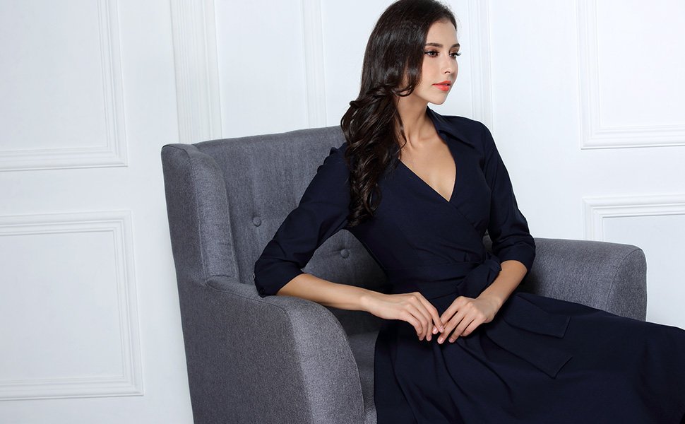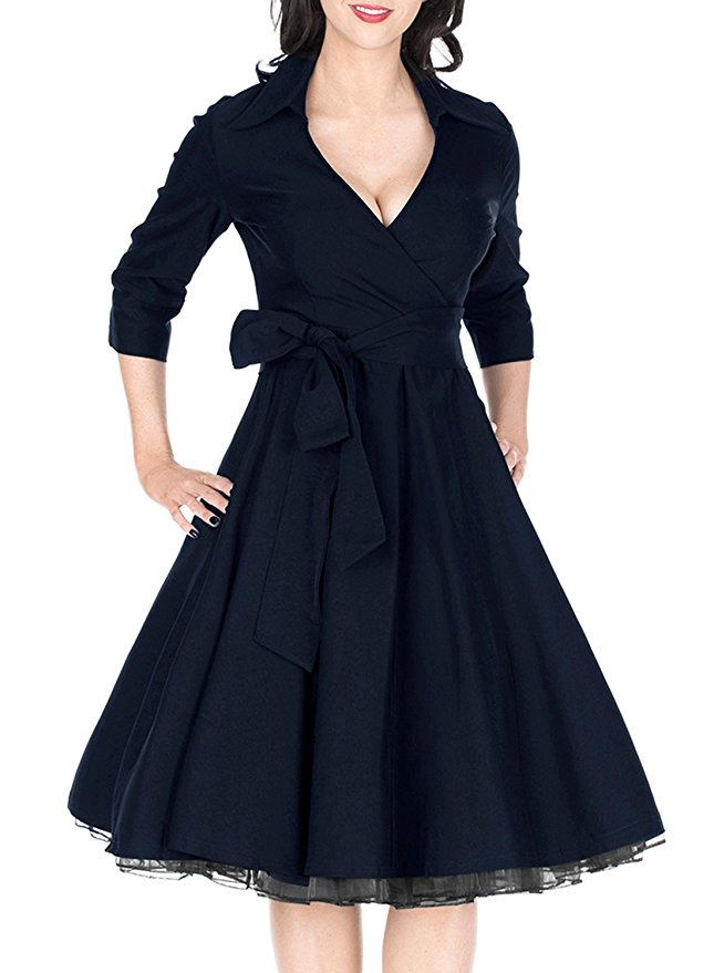 $38.99 $69.99 Maggie Tang Deep-V neck 3/4 Sleeve 50s 60s Vintage Bow Belt Real Wrap Swing Dress