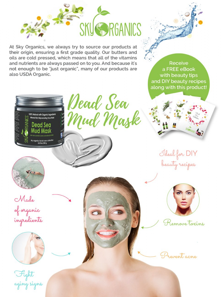 ORGANIC DEAD SEA MUD MASK: Pores, blackheads, and breakouts don't stand a chance against our Dead Sea Mud Mask! As the mask dries, it pulls out the toxins and excess oils present in your skin from poor diet and atmospheric pollution. Your skin will feel clean and refreshed!