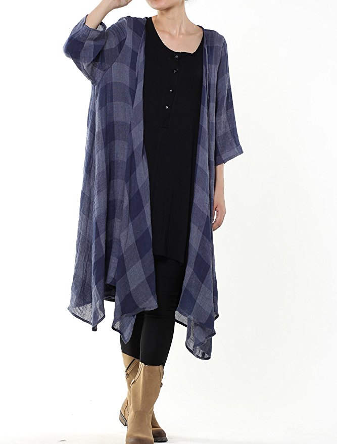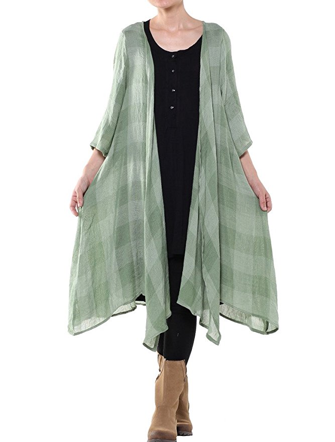 3/4 sleeve for plaid pattern, and long sleeve for solid color.Open front, waterfall asymmetric hem, soft material,light weight wrap design