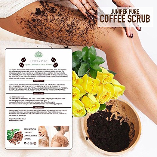 100% NATURAL and ORGANIC - Made with only the PUREST ingredients, and nothing artificial, our Juniper Pure Coffee Scrub is safe for the whole family! Coffee bean grounds and sea salt exfoliates your skin unveiling smooth and healthy skin. Perfect balance of essential oils and vitamins for the softest moisturized skin. Cacao butter and coconut fragrance for a luxuriously sweet experience.Our original formula is suitable for both the body and face.