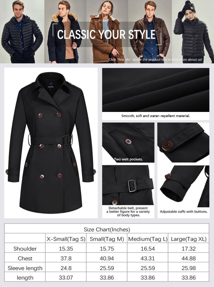 It is really a great choice for spring, fall and winter. The trench coat will make you beautiful everytime when you are with it. It is nice on the outside with a full lining inside. Guaranteed to keep you elegant and unique in any occasions. Wantdo aims to offer high-quality products all the time.