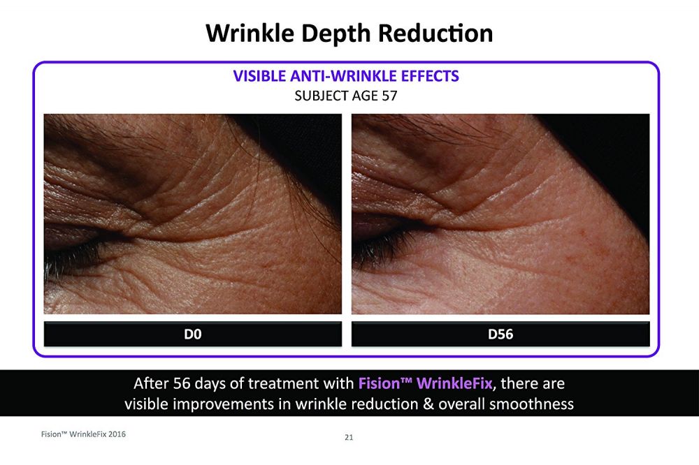 FISION™ LAB TESTS & CLINICAL TRIALS- In lab tests, Fision™ Wrinkle FixFision™ Wrinkle Fix has even outperformed Vitamin C (the gold-standard for anti-aging) in cellular viability and hyaluronic acid synthesis. Fision™ showed a 25x increase in HA synthesis and a 13% increase in cellular vitality vs. Vitamin C. Fision™ also produced 50% more hyaluronic acid synthesis than Glycolic Acid, a known HA booster. In a 56-day clinical trial, participants realized an average decrease of 20% in wrinkle depth when using cream infused with 2% Fision vs. placebo. Notable reductions in age spots were also observed.