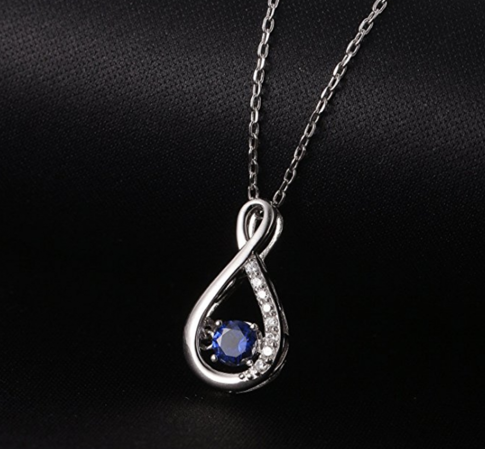 Celebrate your changing, growing and evolving romance with this exceptional gemstone fashion pendant from the Caperci Love Collection. Expertly crafted in sterling silver, this pendant features an infinity symbol-shaped frame accented with shimmering diamond accents. At the center of the symbol, a 4.5mm violet-blue created blue sapphire sparkles in a unique setting that moves with every beat of her heart and every turn of her head. An eye-catching look she's certain to adore, this pendant is polished to a brilliant shine and suspends freely along an 18.0-inch(16''+2'') cable chain that secures with a spring-ring clasp. Great as a gift to give to your loved one to express your love, e.g. mom, lover, girlfriend, fiancee, wife, female friend.