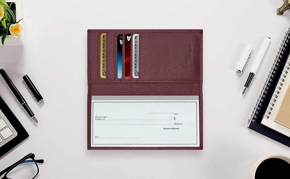 This checkbook cover is designed to securely hold your checkbook and doubles as a credit card holder with 6 RFID blocking credit card slots and a hidden pocket for cash, receipts, additional credit cards or gift cards. The pebble grain leather is durable, lightweight and attractive. This checkbook holder is RFID shielded in and around all pockets and folds. Prevent thieves from remotely accessing (skimming) and reading your credit card account numbers and related private information. Don’t become a victim of the silent crime of Electronic Pickpocketing which may lead to identity theft. Protect and lock your RFID chip enhanced credit cards safely within our proprietary RFID blocking technology. Gift box included. Fits top tear standard checkbooks with dimensions of 6 inches Long and 3 inches Wide.