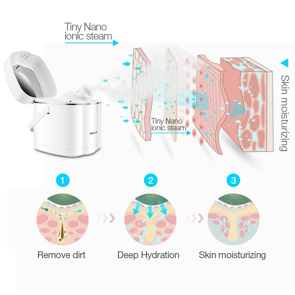 The ultra-fine nanoionic steam effectively penetrates deep into the skin, providing a better hydrating effect and leaving the skin smooth, supple and hydrated