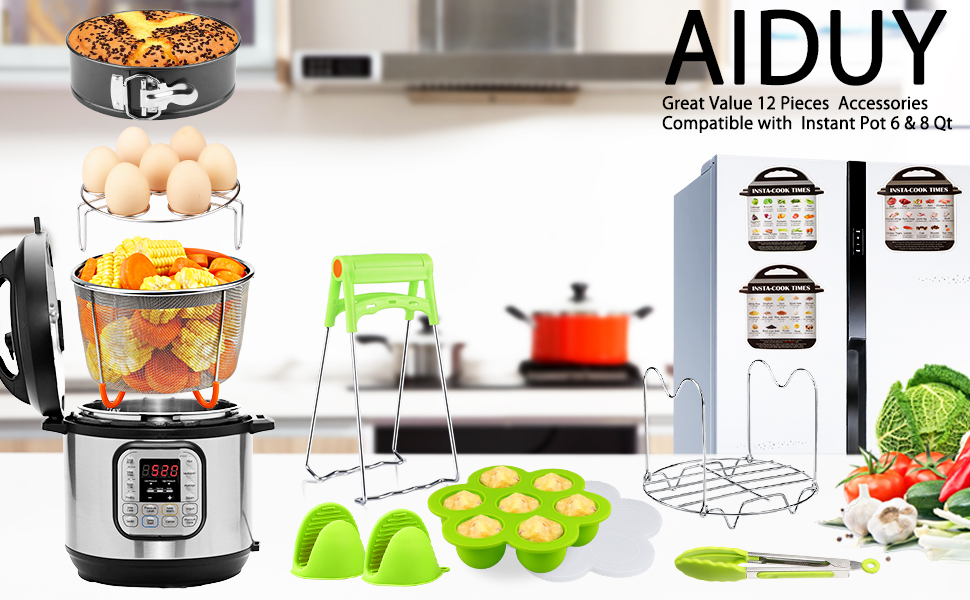 Great Accessory Kit - Value accessories set includes everything you need to cook, will leave a lasting impression on your cooking and baking for years to come. 12-Piece pressure cooker accessories set includes 1 vegetable steamer basket, 1 springform Pan, 1 egg bites mold, 1 egg steamer rack, 1 silicone kitchen tong, 1 dish clip, 1 steam rack trivet with long handle, 2 oven mitts, 3 magnetic cheat sheets. Suitable for all kinds of kitchens.
