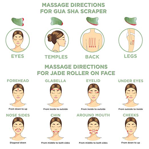 Use the Jade Roller and Gua Sha Stone in an up and outward motion, starting from the base of your Neck toward the Forehead. Always swipe from one side to the other, never back and forth. We recommend using the Jade Roller in the morning to help absorb moisture and brighten your complexion for the long day ahead, then using the Gua Sha tool at night to deeply massage and cleanse your skin for a relaxing night. Each massage shouldn't take longer than 10 minutes to get the desired effect. It's non-invasive and non-sticky, so you can go about your day without having to endure a sticky or itchy feeling on your skin.
