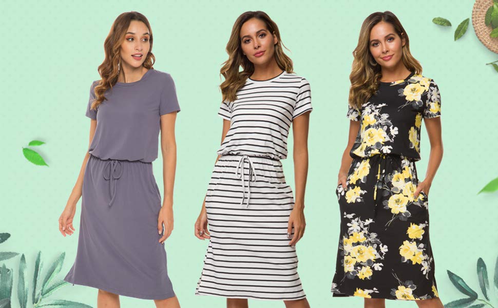 - Features:Casual Style,Two Side Pockets,Short Sleeve,Elastic Waist,Tie-Belt,Midi Dress,Floral Print,Knee Length,Side Split