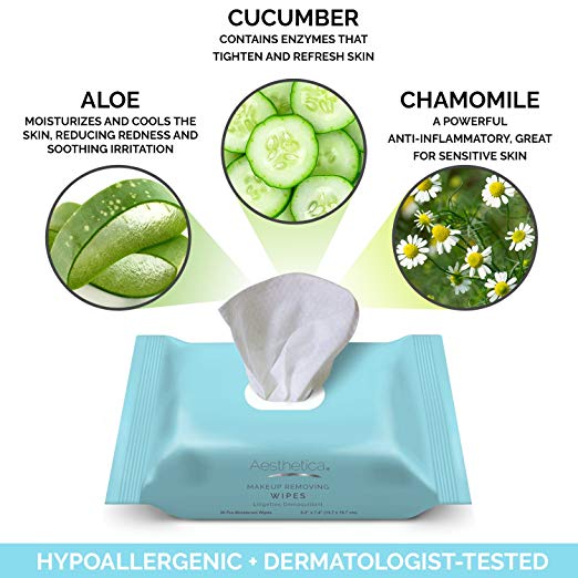 Erase all traces of makeup, dirt and oil with Aesthetica Makeup Removing Wipes. Formulated with calming ingredients such as chamomile, aloe and cucumber extracts, our makeup remover wipes are gentle enough to soothe and condition your skin while quickly removing dirt and impurities. The Aesthetica Makeup Removing Wipes are dermatologist and ophthalmologist tested, hypoallergenic and safe for daily use on the face, lips and delicate eye area. Our makeup remover wipes are suitable for all skin types