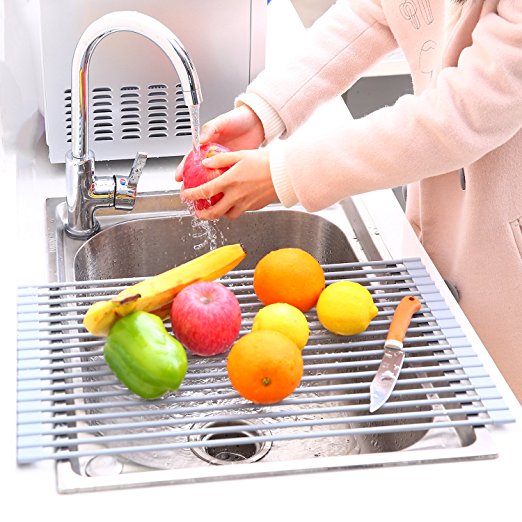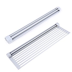 Ohuhu over the sink roll-up dish drying rack is made with premium anti-rust steel, high quality zinc-coated iron sticks and a full non-slip silicone coating. It can act as an over-the-sink dish drying rack or a cooling rack for baked goods. With a roll up design, easily store it away in your cabinet when not in use.