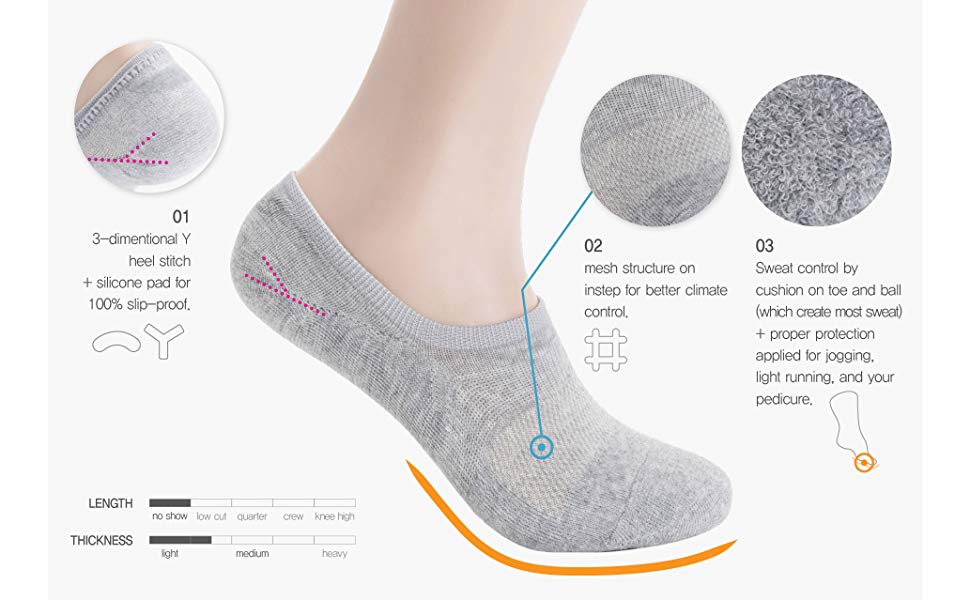 NO MORE PAPER-THIN SOCKS - Toe and Ball padded front cushion absorbs sweat from toe (which create most sweat). And comparatively thick cushioned front also prevent your feet from blister and support your feet when walking, jogging, running workout, and even protect your ultra cute pedicure.