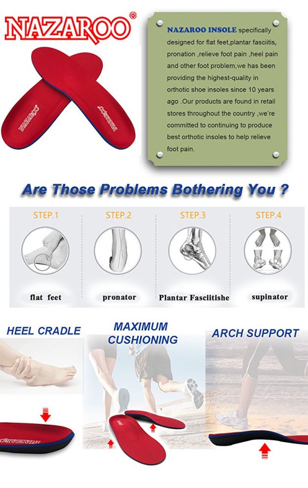 NAZAROO Orthotic Insoles designed for flat feet , Plantar Fasciitis,Its encapsulated design with a firm but flexible support shell, built-in arch support and heel cradle for increased stability. This insoles offer affordable, professional-grade orthotic
