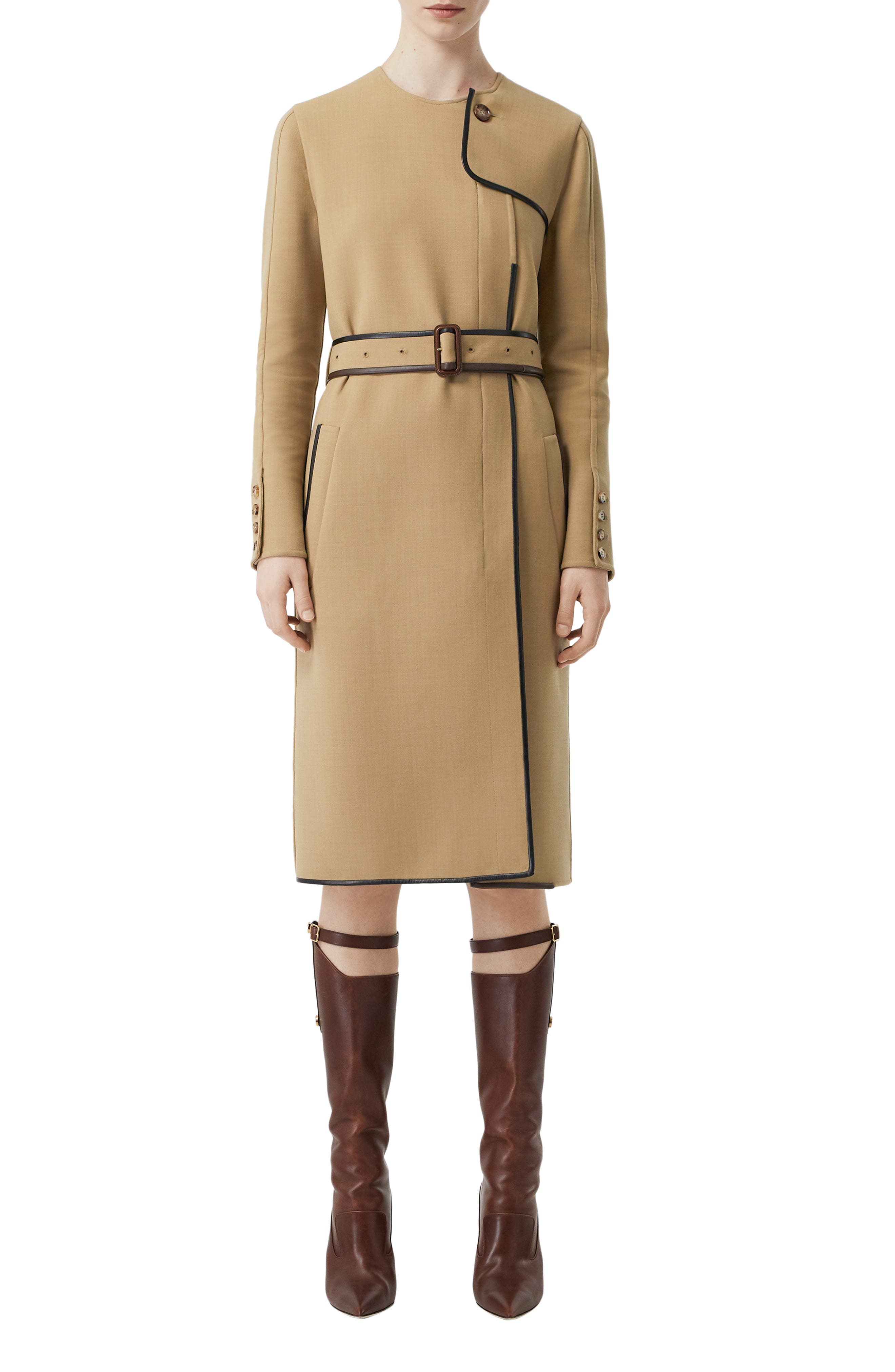 Leather Trim Long Sleeve Trench Dress
