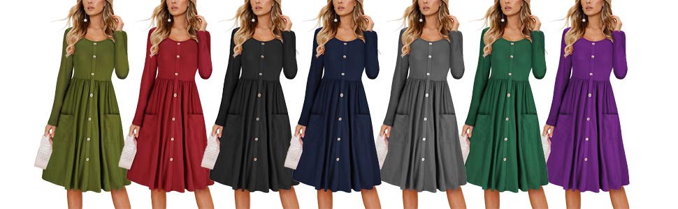 KILIG Women's Long Sleeve Casual Button Down Swing Midi Dress with Pockets