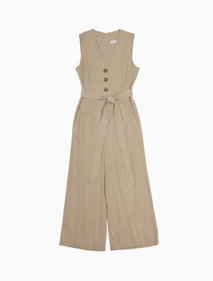 LINEN BLEND BUTTON-FRONT V-NECK BELTED JUMPSUIT