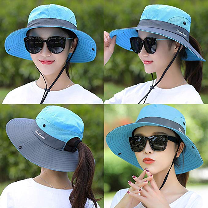 FUNCTIONAL OUTDOOR HAT: The brim is large enough to shade forehead. Inside of the hat is a breathable mesh layer, which can greatly improve cooling, comfortable and airflow. Especially, a ponytail opening in back is considerate design for women. The buttons on both sides of the hat can give you more different styles.