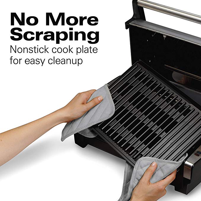 EASY TO CLEAN: Indoor grill hood, plate, and extra large drip tray are all removable and dishwasher safe.