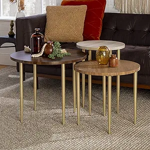 $173 $249 Walker Edison Modern Round Nesting Coffee Table Living Room Accent Ottoman Storage Shelf, Set Of 2, Marble and Gold