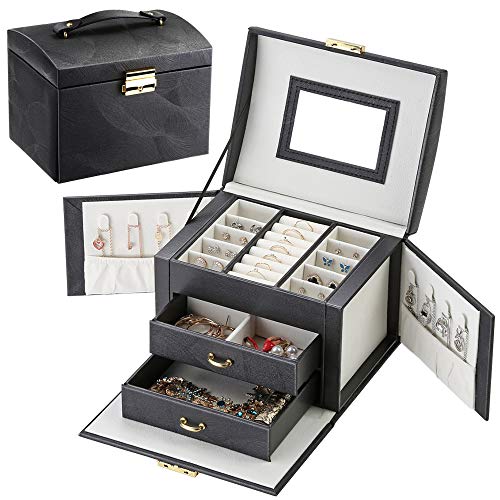 【3 Layer Jewelry Box】Exquisite appearance, reasonable size(6.7" x 5.5" x 5.2"). The jewelry box has a three-layer structure with two drawers inside. A box with all your jewelry. The jewellery oganiser can be put at home like a delicate ornament, it's also can be an essential travel bag for women/girls who travel or business trip.【Good Handcraft and Premium Quality】Made of high quality artificial leather and soft beige velvet linings, attractive surface, durable quality, that could protect your jewelry from dust and scratch. The high-density metal brackets form a semi-automatic opening and closing design, which is more convenient to use.【Elegant Design】Simple and compact design jewellery boxes with elegant outer look perfect for all women and girls. It is a thoughtful gift for wedding, birthday party.【Protect Your Jewelry】All of your earrings, bracelets, and rings piling up on the shelf or dresser? Beautiful trinkets can't just be shoved into a dark drawer or hung on a nail, they require a stylish jewellery box for safe keeping【Great Gift Idea】With a simple & stylish design, this jewelry case will be a practical gift for jewellery & accessories lovers; Simple appearance is elegant and attractive, surely a sweet gift idea for holidays and other special days.