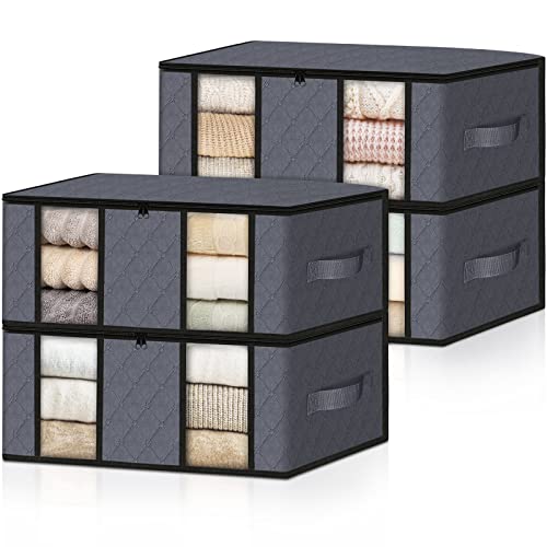 HomeHacks Storage Clothing Storage Bags, Storage Box Clothes Organizer with Clear Windows, Sturdy Handles Clothing Storage for Cloth, Toy, Bedding Storage, 4-Pack, Grey