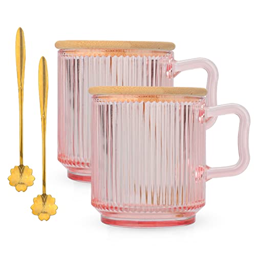 tronco 12 OZ Glass Coffee Mug with Bamboo Lid and Cherry Blossoms Spoon, 2 Pack Classical Vertical Stripes Glass Tea Cup, Coffee Glasses, Pretty Coffee Mug, Ideal for Milk, Latte, Juice, Tea, Water