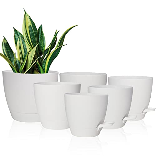 Vanslogreen Plant Pots for Indoor Plants 5 Pack Self Watering Planters, 7/6.5/6/5.5/5 Inch Self Watering Pots with Drainage Hole Plastic Flower Pot for Herbs, Succulents, African Violet (White)