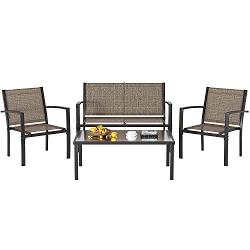 Greesum 4 Pieces Patio Furniture Set, Outdoor Conversation Sets for Patio, Lawn, Garden, Poolside with A Glass Coffee Table, Brown