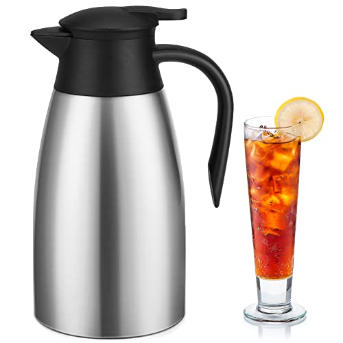 Retention Temperature:The double layer 304 stainless steel material ensures the heat preservation and cold protection performance of the pot, Our pot can keep warm for up to 12 hours,Keep cold for up to 24 hours.Premium Quality,Leak Proof:Our coffee thermal carafe adopt 304 food grade stainless steel interior and exterior, Which is durable, reusable, easy to clean, and ideal for indoor and outdoor.This coffee carafe is capacity of 68 Oz (2L) and with Highly Sealed Silicone ring makes a leakproof pot.Ergonomic Design:The one-piece plastic handle of pot is easily pressed and lifted to pour water effortlessly.Press-down opening/closing mechanism, Press to Pour and The lid can be removed by rotating it. The one-handed operation is simple and convenient. PP material handle to avoid burns and the V - spout does not splash when pouring water.Versatile Dispenser: Our vacuum thermal carafe is not only perfect used as coffee thermos dispenser, but also as Tea/milk/Juice/Wine carafe, hot water pitcher.Very important tips: It is important to precool and preheat for five minutesWorry Free Guarantee: Please do not add swellable liquids such as carbonated drinks, and clean it up in time after use. If you are not satisfied with thermal coffee carafe, feel free to contact us within 30 days, you will get a hassle-free full refund.
