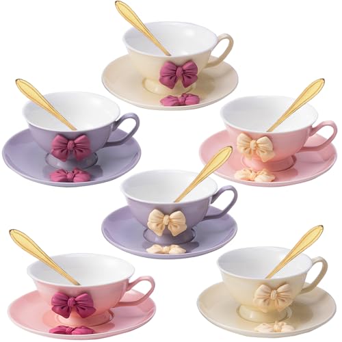 ICHAG Set of 6 Cups and Saucers|Coffee Mug|Cute Coffee Cup with Bowknot|6.7oz/200ml|18-piece|With spoon|Tea Cup Set with Ceramic|For Tea,Latte,Cappuccino,Espresso