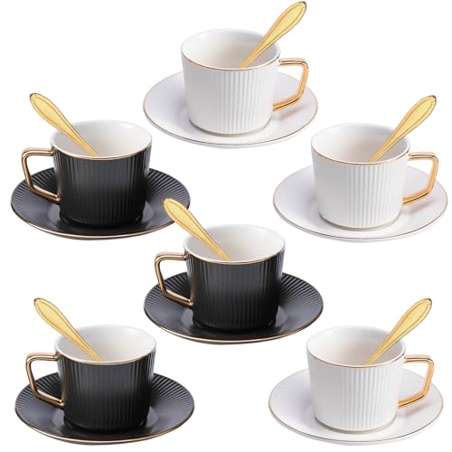 ICHAG Set of 6 Cups and Saucers|Coffee Mug|Ceramic Striped Coffee Cups|8.1oz/240ml|18-piece|With spoon|Tea Cup Set with Gold Trim|For Tea,Latte,Cappuccino,Espresso
