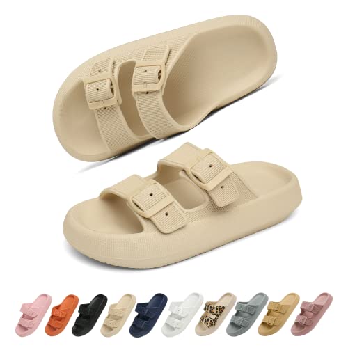 【Newly Upgraded 1.77-Inch Thick Sole】The newly upgraded super-thick EVA outsole is 0.6 inches thicker than ordinary models on the market. The shoes are light and pressure-resistant as a whole, provide excellent stability and shock absorption, and effectively absorb shocks, making you feel as if you are walking on clouds, and you will love to walk from now on!【Ergonomic Design】Cloud slippers are ergonomically designed. The head of the slippers are tilted forward by about 30°, which adapts to the walking habit of the human body, balances the pressure, and makes wearing more comfortable; at the same time, the shoe body adopts a concave design, which fits the sole of the foot to prevent toe collision and reduce foot injury.【Plantary Fasciitis Friendly Design】The 1.77inch super-thick rebound sole can effectively absorb vibration during wearing, thereby reducing the pressure on the feet, knees, and back, so it is highly recommended for people with plantar fasciitis!【Non-Slip and Easy-To-Clean Design】The inner side of this cloud slippers is designed with diamond-shaped protrusions, and the sole is designed with wavy bumps and non-slip, which increases friction, is not easy to slip, double anti-slip, and double safety. At the same time, the upper and the sole EVA material are integrally formed, the surface is stain-resistant, and it is easier to wipe and clean.【Highly Recommended】These slippers are suitable for many occasions indoor and outdoor, suitable for all seasons! Note: EVA material may shrink and deform in high temperature. Please do not expose to the sun for a long time. If the upper is too wide, the body of the shoe can be customized through the principle of high temperature shrinkage.