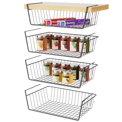 Under Shelf Basket, Veckle 4 Pack Stackable Under Cabinet Storage Space Saving Hanging Basket Easy to Install Pantry Organizer for Kitchen Bookshelf Cupboard, Black