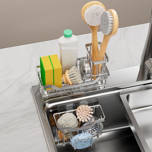 【3-IN-1 Set】: Our sink caddy set contains: counter sponge organizer + brush holder+sink sponge holder. Counter sponge organizer & brush holder can be used to place on the counter to hold sponges, soap dispenser and brushes. The sink sponge Holder can be hung inside the sink to hold the cleaning sponge & brush.【Rustproof Stainless Steel】: Our sink sponge caddy set is made of stainless steel material, which is rust-proof and not afraid of oil stains. The durable and strong structure can better carry cleaning supplies and can be used for a long time.【Removable Drip Tray】: There is a drip tray under the sink rack, which can collect dripping water from sponges and brushes. It is easy to pull out and pour into the sink to keep the countertop clean and tidy.【Strong Adhesive】: The sink sponge holder is equipped with adhesive. Stick the adhesive on the inner wall of the sink, and then hang the sink sponge holder on it. The sink organizer can perfectly store cleaning sponges and other cleaning supplies. The adhesive will not fall off after long-term use.【Multi-Use】: Compared with other sink caddy, ours has more functions. Our Kitchen Sponge Organizer + Brush Holder can be placed on the counter to store items, and the sink sponge holder can be hung in the sink to store cleaning sponges. A set of sink caddy can perfectly solve your kitchen cleaning supplies storage problem.