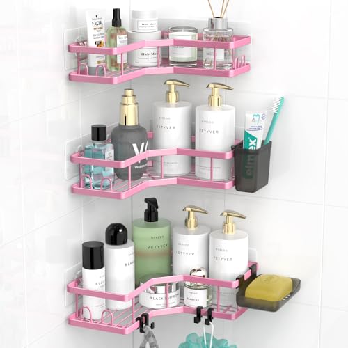 [Space-Saving & Stylish Design]: Upgrade L-Shaped corner shower caddy is designed for making great use of corner space. Great shower organizer can organize most toiletries in the bathroom and help to create a clean finished look in your shower. Extremely handy for shower organizing.[Strong Adhesive & Sturdy]: The adhesive is super sticky for flat surfaces and provides a strong hold up to 40 lbs. Shower caddy is very sturdy to hold big bottles, such as gallon size shampoo and conditioner, body wash and other fairly heavy items. Please note: This shower shelf fits 90 degrees wall corner only, not suitable for rounded or curved corner space.[No Drilling & Easy installing]: No tools or drilling is required. Shower corner shelves are easy to install with the large-area adhesive. Simple installation: First, ensure that area is cleaned and dry before installing. Second, draw a line with an erasable marker to mark the position where the adhesive will be placed. Third, stick the adhesive hooks to wall. Finally, place shelves on the adhesive hooks.[Suitable Walls & Occasions]: Shower corner organizer can be installed on the smooth tile, marble, glass, wood wall and solid metal walls. Perfect addition to bathroom, toilet, kitchen, powder room and living room. Nice looking and versatile corner organizers![Premium Material & Package Contents]: Corner shower organizer is made of stainless steel, coated with rustproof paint and the solid frame wire is much more thickened than old version shower caddies. Package included: 2 x corner shower caddy, 4 x adhesive, 4 x plastic hook, 2 x toothpaste holder.