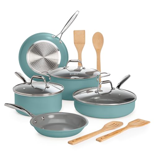 Goodful Ceramic Nonstick Pots and Pans Set, Titanium-Reinforced Premium Nonstick Coating, Dishwasher Safe Pots and Pans, Tempered Glass Steam Vented Lids, Stainless Steel Handles, 12-Piece, Blue