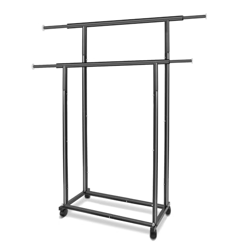 Simple: made of premium metal tubes, the rack is both strong and durable, the perfect solution for your home or to display garments. Double rod design provides more hanging space to display well and organize your plenty of clothes, bags, hats, and scarf.EXTENSIBLE:Extensible top horizontal rod from 30.5” to 48”. Top hanging rail designed with integrated circular tubing and stoppers on each side to prevent the clothes from fallingDURABLE&STURDY:Made of a highly resistant metal with premium baking paint to enhance protection against rust & corrosion.EXTRA STORAGE&MOBILE RACK:The grid bottom shelf for boxes to create extra storage, and four 360°wheels(with brakes) in bottom for easy movingEASY TO ASSEMBLE: Our wgarment rack is easy to assemble with clear instruction. Certain shelves must be installed in a particular order. Just be sure to read the assembly directions carefully BEFORE you start putting it together.DIMENSION:(30.5"-48")W x 15"D x 65.5"H.