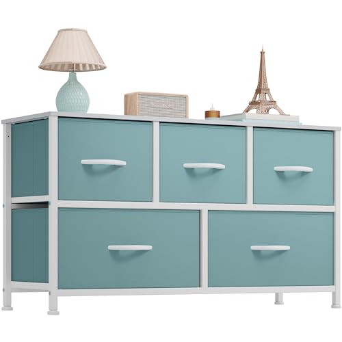 YITAHOME Wide Storage Tower with 5 Drawers - Fabric Dresser, Organizer Unit for Bedroom, Living Room, Closets & Nursery - Sturdy Steel Frame, Easy Pull Fabric Bins & Wooden Top (Green)