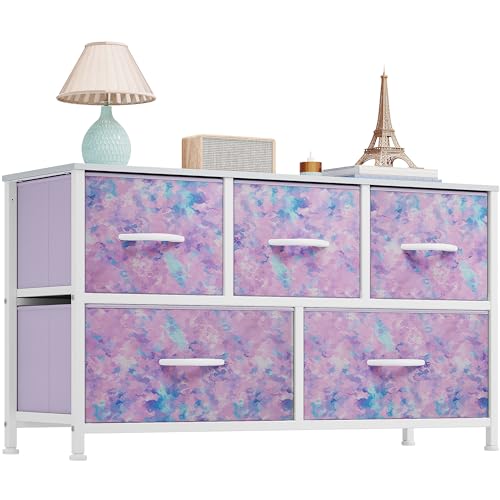 YITAHOME Wide Storage Tower with 5 Drawers - Fabric Dresser, Organizer Unit for Bedroom, Living Room, Closets & Nursery - Sturdy Steel Frame, Easy Pull Fabric Bins & Wooden Top (Tie-dye Purple)