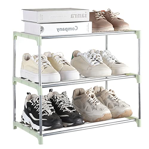 Fouews Small Shoe Rack, Narrow Stackable Shoe Shelf Organizer for Entryway, Doorway and Bedroom Closet (3-Tier, Green)