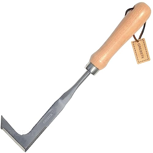 Great tool for removing stubborn moss and weeds in between pave stones. The sharp edge cutting part of the tool easily cleaned off weeds and moss from the stones and helped edge grass line very effectively.Length: 13 inch, net weight: 0.44 lb. L shape blade for sod cutting in different directions.Beech handle is strong and lightweight, and the handle with hole is convenient for storage. Sharpened and hardened stainless steel blade for durability and abrasion resistance.Ideal for removing grass, moss, weeds from gaps between paving. It gets in the tightest areas with surprising precision, and it's perfect for lifting out smaller tap rooted weeds intact. Its sharp, narrow blade rips up tough soil.The GREBSTK brand manual weeder help remove weeds and grass from between patio stones and driveway cracks. Perfect weeder for gardens and especially sidewalk cracks and other tight spaces.