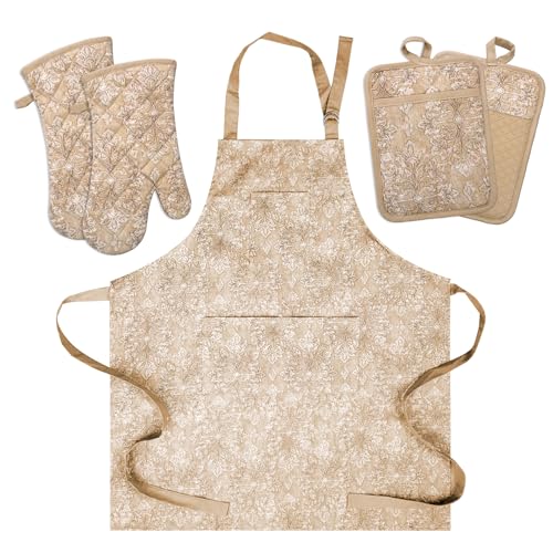 Oven Mitts and Pot Holders with Cooking Apron set of 5, Heat Resistant Kitchen Gloves and Silicone Non-Slip Potholders, Adjustable Neck Buckle Chef Apron, Cotton Nice Design for Cooking (Tawny)