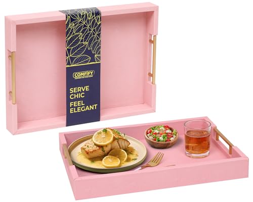 Decorative Serving Tray - Pink Faux Leather + Golden Stainless Steel Handles - Use with Ottoman, Coffee Table, Cosmetics, Jewelry, Skincare, Décor Organization & More - 12 x17 inch Comfify