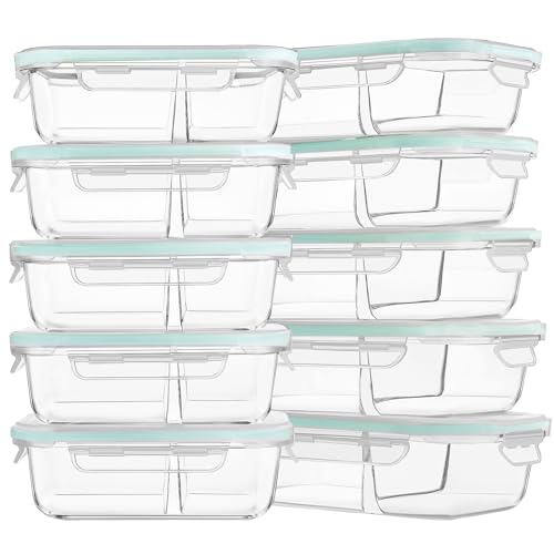 HOMBERKING 10 Pack Glass Meal Prep Containers 2 Compartment, Glass Food Storage Containers with Lids, Airtight Glass Lunch Bento Boxes, BPA-Free & Leak Proof (10 lids & 10 Containers) - Blue