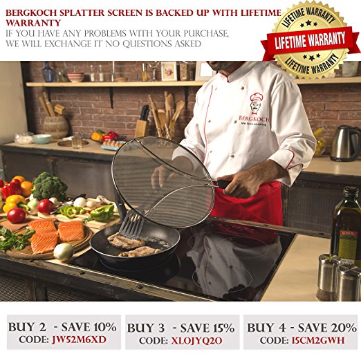 LIFETIME GUARANTEE: Heavy duty stainless steel construction is crafted with the same essence as all German kitchenware to last for years, so the BergKoch Splatter Screen for cooking is backed up with hassle-free LifeTime Warranty - If you have any problems with your purchase, we will exchange it no questions asked