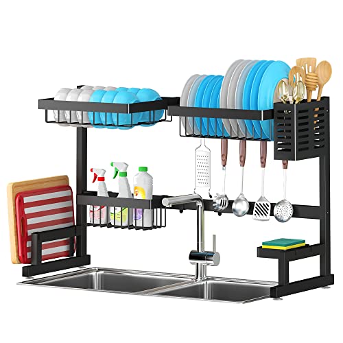 All-IN-ONE KITCHEN SPACE SAVER! Use Pusdon dish drying rack over the sink or on the counter, save tons of space and time by making it easier to organize utensils and supplies, water will drop into the sink directly, make your kitchen cleaner and tidy. Comes with step-by-step assembly instruction, easy to assemble, all accessories are carefully packed. Great for home use dish drainer or different gift ideas such as Housewarming, Thanksgiving, Christmas or holiday gifts.SIZE ADJUSTABLE UPGRADED VERSION! Shelf size: 26-37.5"L x 12.5"W x 20.4"H, length is adjustable between 26"-37.5" according to your needs, fits for 99% different sinks. The height of the faucet should be ≤ 16. 5 inches, the height between the cabinet bottom to the countertop should be ≥ 28 inches. Please DO carefully measure 3 numerical values: The width of your kitchen sink, the height of the faucet and the height between the cabinet bottom to the counter top before buying.NEAT KITCHEN, HAPPY COOKING! Enjoy your cooking every day with this multifunctional kitchen storage organizer. The dish drainer rack can store various sizes of utensils, including 1 dish rack, 1 bowl rack, 1 knife holder, 1 fruit & vegetable basket, 1 chopping board rack /pot cover holder, 1 square basket/detergent holder, 1 cutlery holder/chopsticks cage, 1 cup/glass holder and 8 hooks. All these parts could be removable and reset thus you could DIY your own dish drainers for kitchen counter.FUNCTIONAL yet THOUGHTFUL DESIGN! Each Pusdon over sink dish drying rack comes with thoughtful assemble accessories pack, including 1 or 2 extra screws as backup.Easy to assemble but fun to use.QUALITY SERVICE! Made by advanced 304 stainless steel, ensure long lasting durability, easy to clean. Bearing more than 60 pounds, stable and not leaning forward. Anti-slip suction cup at the bottom for reinforcement stability. Pusdon also provides lifetime after-sales service support for this kitchen storage rack. All over sink racks sold by Pusdon have been 100% QC tested, we give you the full persent satisfaction, thus you can buy this dish drainer and use it with confidence.